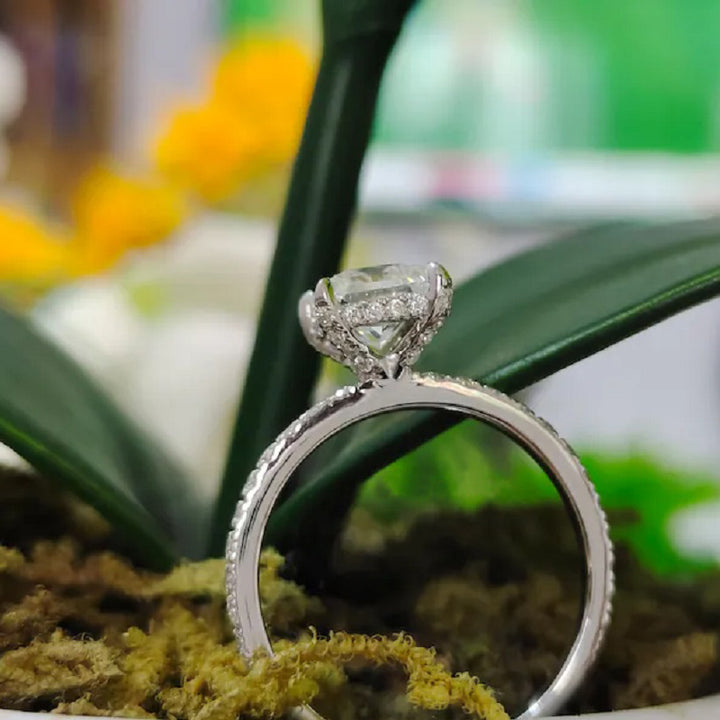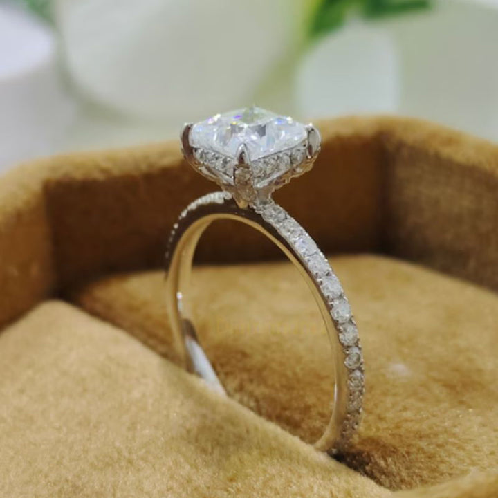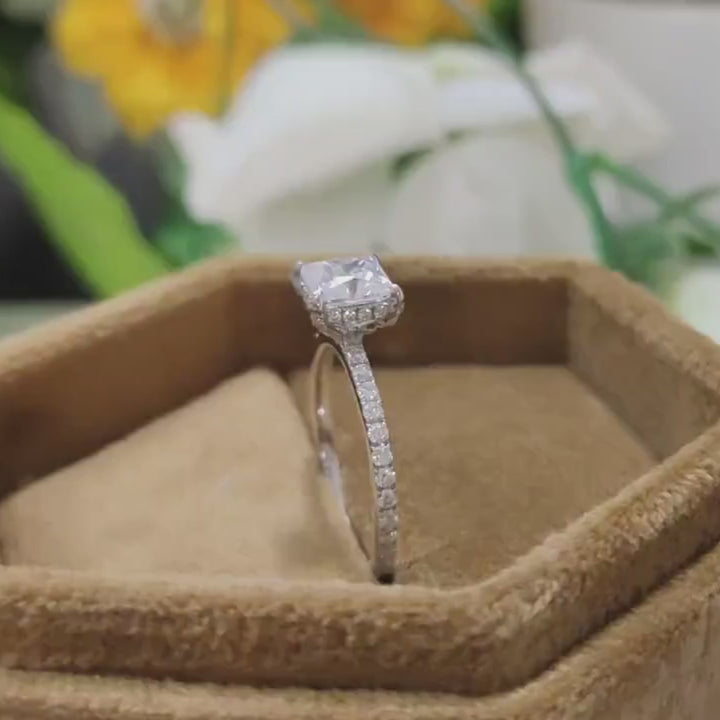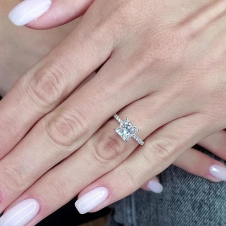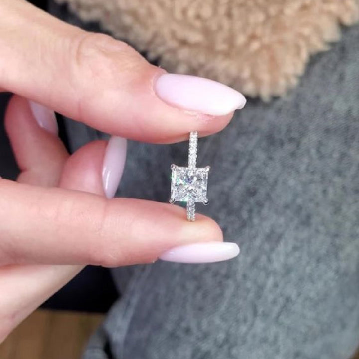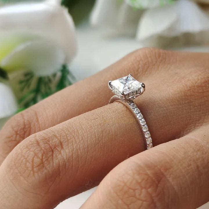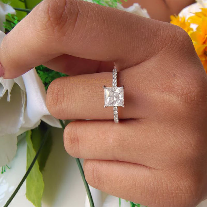 This exquisite ring is firmly set with a princess-shaped moissanite using four-prong setting technology. It looks like an elegant princess, sitting on the ring, exuding a light that cannot be ignored. Every edge and corner of this ring is precisely cut, reflecting the brilliance of fire, as if every ray of light is telling the purity and firmness of love.